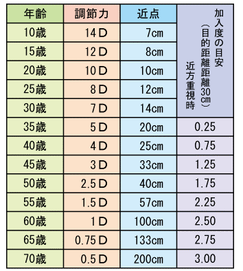 調節力:水晶体を膨らまし近くにピントを合わせる力。