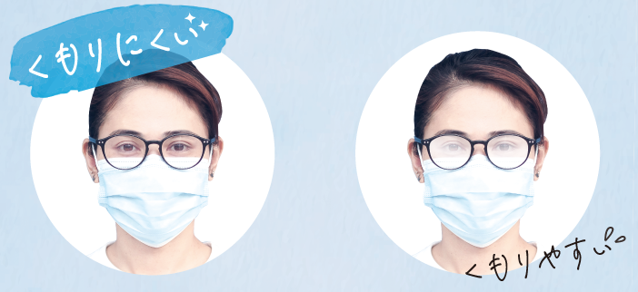 広告やインターネットで「曇らないメガネ」レンズと表示されている場合がありますが、曇らないメガネレンズは現在のところ開発されていません。一般のメガネレンズに比べて「曇りにくいレンズ」はあります。