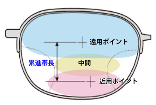 遠近両用レンズはいくつもの度数を備えています。上部の遠用部の面積と近用部の面積が広いほうが眼の移行も自然に行えます。ですから最初はなるべくレンズの上下幅が広いフレームを選び、累進帯の長いレンズを選んだ方が使いやすいことになります。
