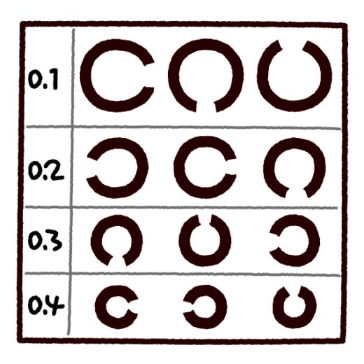 遠近両用メガネを製作する時には遠くの見える状態や、近くの見える状態を把握するために自覚的検査(見える、見えないと自身で伝える検査/視力表を使用)および、他覚的検査(機械などを用いて客観的に測定する検査/器械で測定)を行って、遠近両用レンズに入る度数を決めなければなりません。