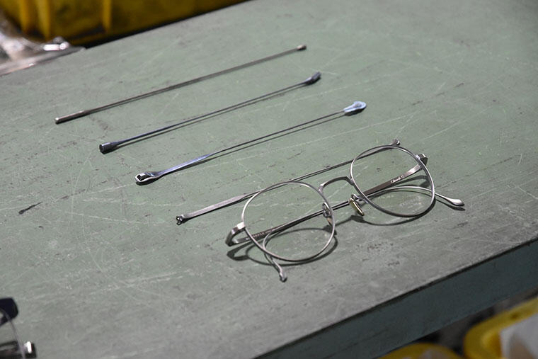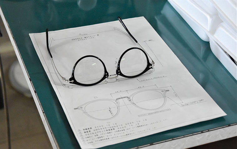 メタルフレームであれば手作業で金属の板からパーツを切り出し、ロウ付け(溶接)をして、原寸大のプロトタイプを作製。デザインとしての完成度はもちろん、掛けやすさなど眼鏡としての機能性についても十分に検証してから、寸法も入った設計図面へと落とし込まれる。