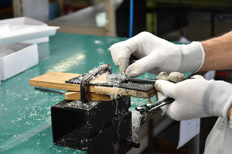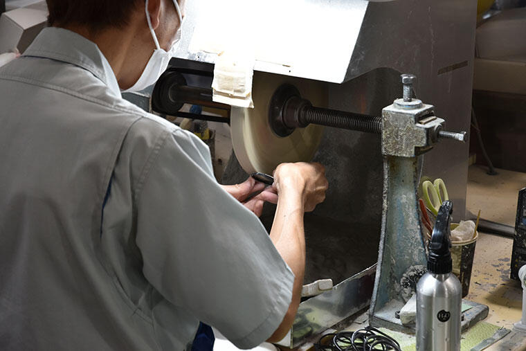 機械を使う工程のみならず、職人による昔ながらの手作業も多く必要とするのがメガネフレーム作りだ。この「きさげがけ」といわれる工程では、フラットに切り出されたテンプルの表面を小刀のような工具で削り、傷を取りながら面や角を粗めに整えていく。量産品では省かれることもある工程で、このひと手間が仕上がりを大きく左右する。