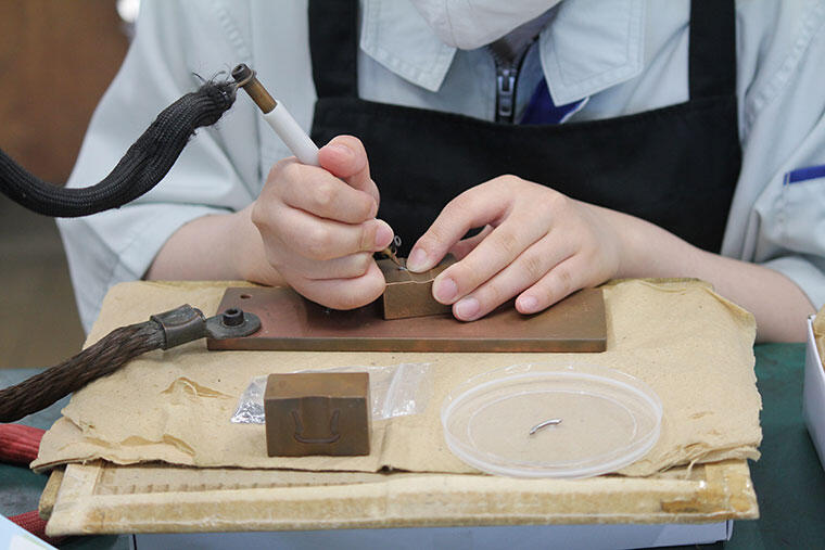パーツが精巧であっても、ロウ付けに僅かでもズレが生じてしまえば眼鏡枠全体に歪みが生じてしまう。フレームの安定性や耐久性を左右する重要な工程です。