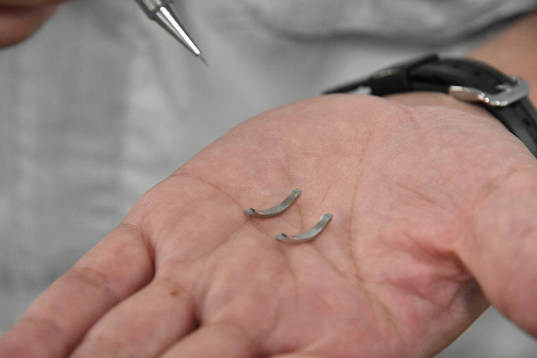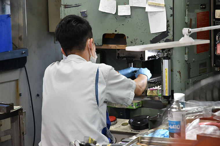 メタルフレームには、チタン素材を採用。それらはもともとは丸線状や板状であり、専用の金型にセットしてプレス機で数十トンから数百トンもの圧をかけてパーツの形へと成型していく。