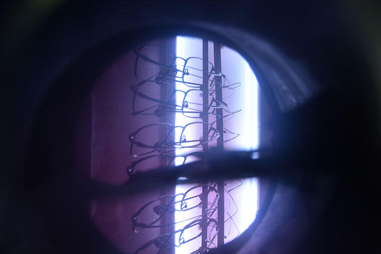 このガラ磨きは、メタル・プラスチックフレームともに行なわれる工程だが、中に入れる研磨剤の組成や磨く時間、ガラを回す速度は素材やデザインによっても異なります。