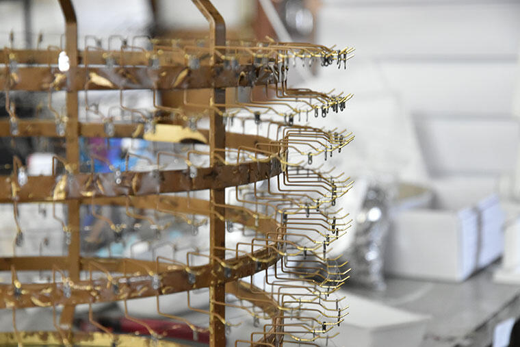 ハンガーに掛けられた小さなパーツはネジを受けるワッシャーです。正面からは見えない部分のパーツにも、きちんとメッキを施します。こうした丁寧な工程が、全体の質感を高めるのだ。