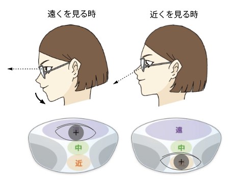 遠近両用レンズは上部から下部に向かって、遠くから近くを見るための違った度数が並んでいます。だから遠くを見たいとき、顔を動かさずに目だけで上を見て、近くを見たいときは目だけで下を見るようにします。