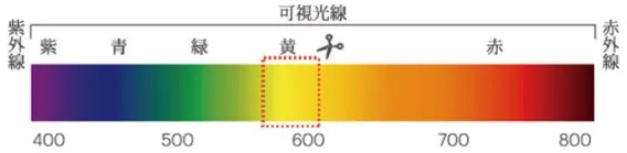 可視光線の中の黄色波長(585nm)のみを極端にカットしたレンズです。濃いレンズカラーで遮光するサングラスとは異なり、色が薄いレンズカラーでも眩しさを抑える効果があります。
