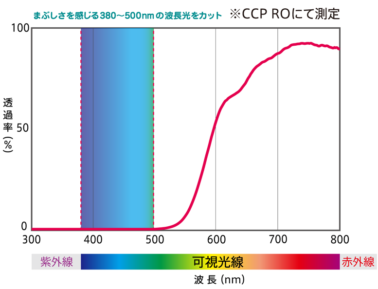 遮光レンズ『CCP』は、この網膜や角膜に大きな影響を与える380~500nmの青色の波長光を抑え、まぶしさを感じる眼疾患の違和感を緩和させることに成功しました。