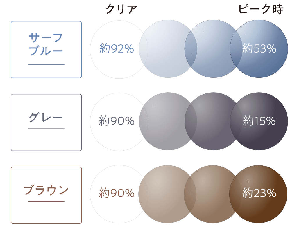 ⑨特殊レンズカラー:調光レンズカラー(紫外線または可視光線によってカラーの濃度が変わります)
