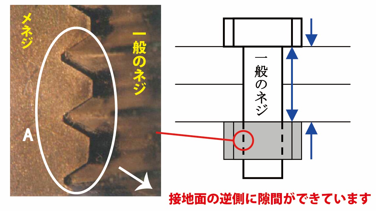 一般のネジでは締めてもどうしても隙間ができてしまいますが、ネジ山部に隙間を作ることで締めたことによる反発力で隙間がなくなります。