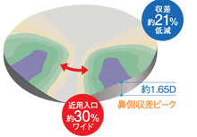 ユレ・ゆがみ改善と同時に収差を大幅低減。さらに最大収差を極限まで抑えることで中近用部の使い心地を向上し、ボケの少ないソフトでスムーズな視界を提供します。