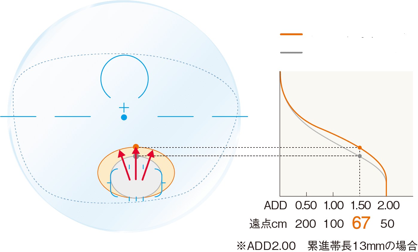 遠用エリアと近用エリアの比率を変え、近方視にフォーカスした、高加入度ユーザーに好適なニューバランスデザインです。