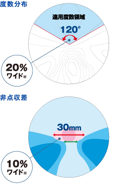 遠洋度数領域を従来の度数に比べて左右20°拡大し120°に設計。遠方視野がよりワイドになりました。