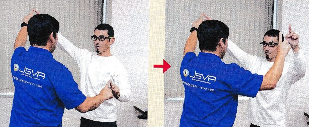 手が触れられるくらいの距離で向かい合って立ち、お互いの目を見たまま、相手に人差し指をいろんな方向に出してもらい、相手の指と自分の指を正確にタッチさせる。